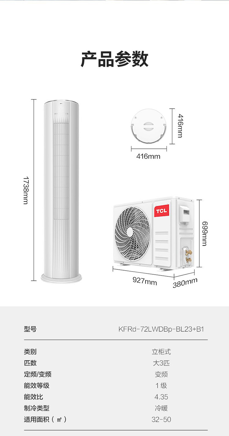 TCL 空调 3P变频 冷暖 新一级能效 柜机 KFRd-72LW/DBp-BL23+B1